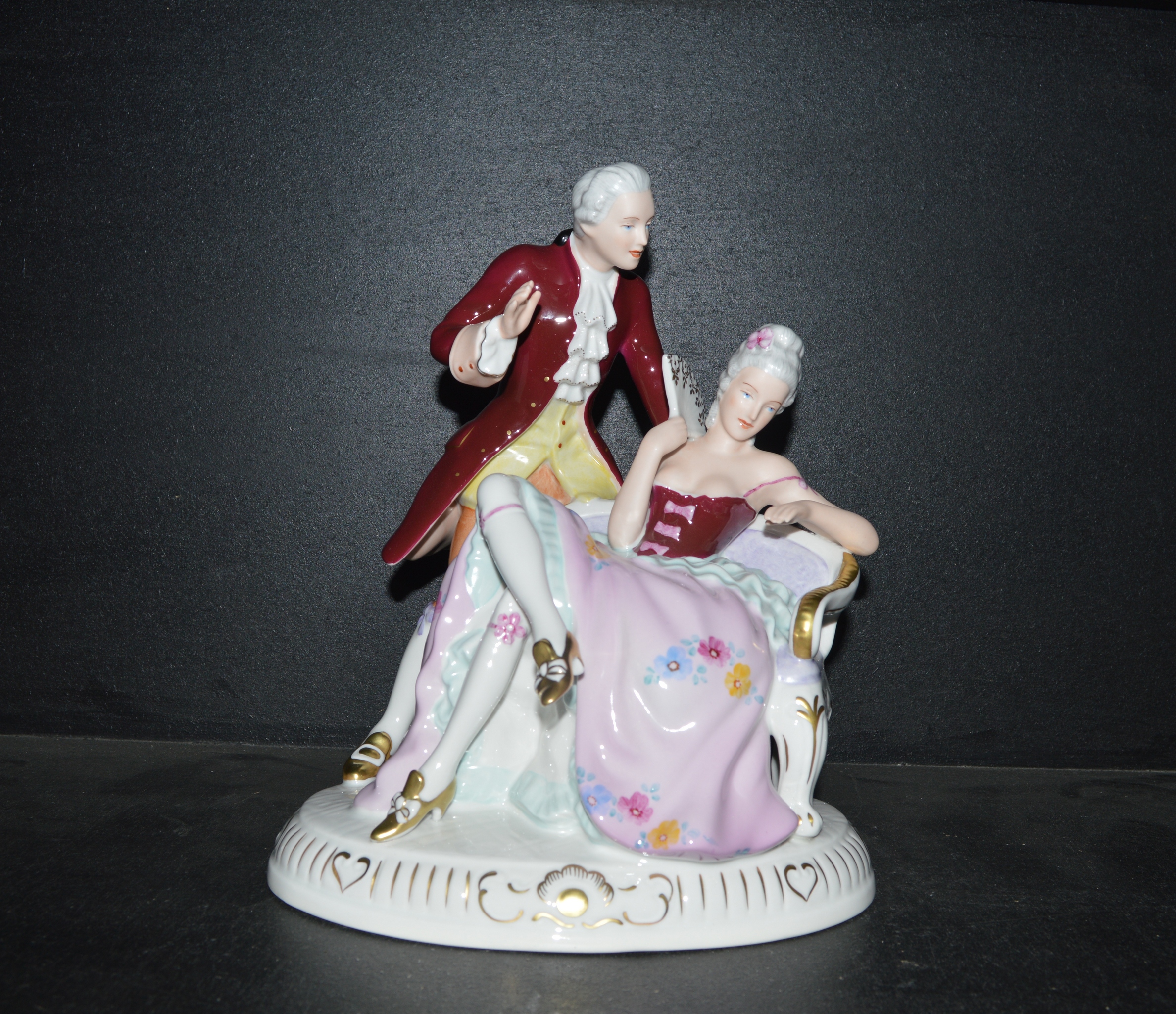 SAXE: Glazovaný povrch výrobku je dekorován naglazurovými barvami štětcem. Pro tento způsob dekorace jsou typické jasné a zářivé barvy, které jsou doplňovány malbou květinových motivů a dekorací zlatem. Dekorační technika Saxe je často využívaná k dekoraci porcelánových figur s lidskými motivy.