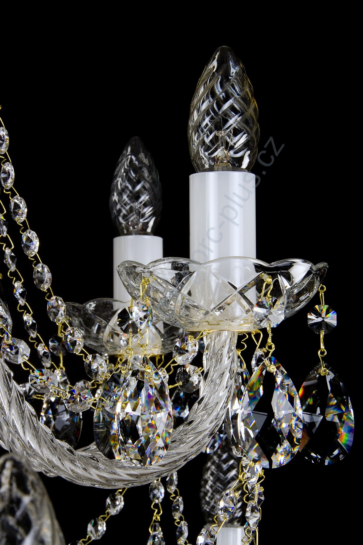 Velikost tohoto křišťálového lustru je 59 x 57 cm. Navíc je lustr dozdoben zlatým řetězem.